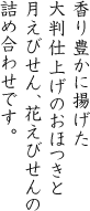 ホーム花和 包装イメージ 商品コード:51 花和(24枚入り) 花えびせん9枚、花えびせん(黒ごま)3枚、花えびせん(青のり)3枚、月えびせん3枚、おほつき6枚 サイズ:300×252×55 2,160 円(税込) のし 包装のみ紅白蝶結び(名入希望)結び切り(名入希望)黄のし(名入希望)蓮のし(名入希望)紅白蝶結び(無地)結び切り(無地)黄のし(無地)蓮のし(無地) かけ方 数量個 カートに入れる 包装イメージ 商品コード:52 花和(30枚入り) 花えびせん9枚、花えびせん(黒ごま)3枚、花えびせん(青のり)3枚、月えびせん3枚、おほつき12枚 サイズ:407×252×56 2,700 円(税込) のし 包装のみ紅白蝶結び(名入希望)結び切り(名入希望)黄のし(名入希望)蓮のし(名入希望)紅白蝶結び(無地)結び切り(無地)黄のし(無地)蓮のし(無地) かけ方 数量個 カートに入れる 包装イメージ 商品コード:53 花和(36枚入り) 花えびせん12枚、花えびせん(黒ごま)4枚、花えびせん(青のり)4枚、月えびせん4枚、おほつき12枚 サイズ:407×252×67 3,240 円(税込) のし 包装のみ紅白蝶結び(名入希望)結び切り(名入希望)黄のし(名入希望)蓮のし(名入希望)紅白蝶結び(無地)結び切り(無地)黄のし(無地)蓮のし(無地) かけ方 数量個 カートに入れる 包装紙 手提げ袋 大・中・小のサイズをご用意しております。 ご入り用の方はご注文の際に備考蘭にご記入ください。 原材料名などの表記 原材料名 えび、澱粉、米粉、小麦粉、黒ごま、青のり、砂糖、食塩、植物油、調味料(アミノ酸等)、酸化防止剤(茶抽出物・ビタミンE) アレルゲン 小麦、えび 賞味期限 製造から90日 保存方法 常温。但し、直射日光・高温多湿はお避け下さい。 お取り扱い上の注意 開封後はお早めにお召し上がり下さい。 品質管理には万全を期しておりますが、万一変質等お気付きの点がございましたら、お買い上げの店名と日付をお書き添えの上、送料着払いで弊社お客様係宛にお送り下さい。代品をお届け致します。 お支払い方法 配送方法 送料について