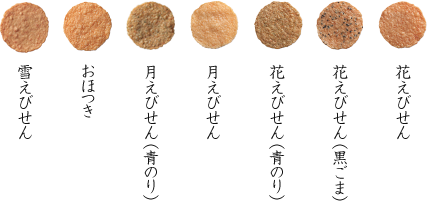花えびせん / 花えびせん(黒ごま) / 花えびせん(青のり) / 月えびせん / 月えびせん(青のり) / おほつき / 雪えびせん